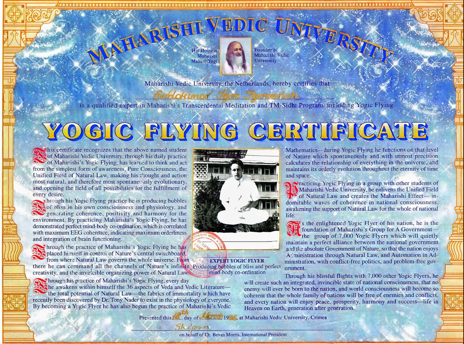 Тогда каждому летающему Сиддху из Голландии прислали полетные сертификаты, в которые надо было вклеить свое фото в полете. Тогда не было цифровых камер, да и цветной пленки хорошей было не достать. И такие фото на сертификаты делали всем на ч/б пленку в зале. Фотограф Василий, хорошо набил себе руку, фотографируя каждого индивидуально, и Маза Дэвайн попросили сделать коллективный снимок для Голландии.