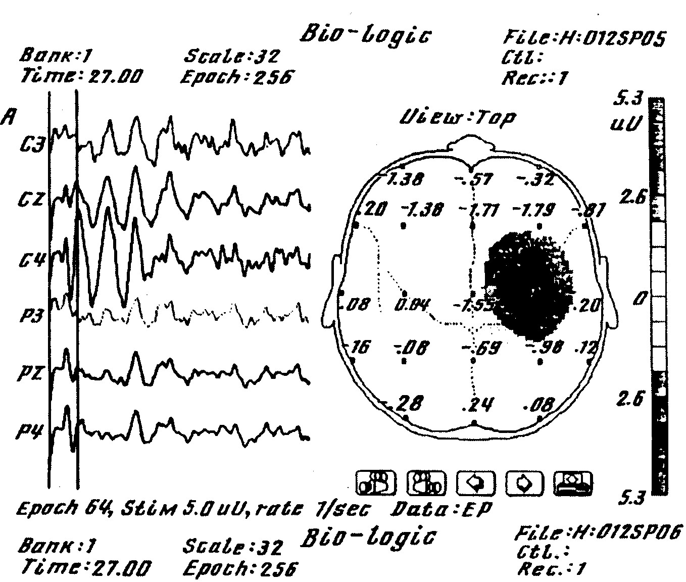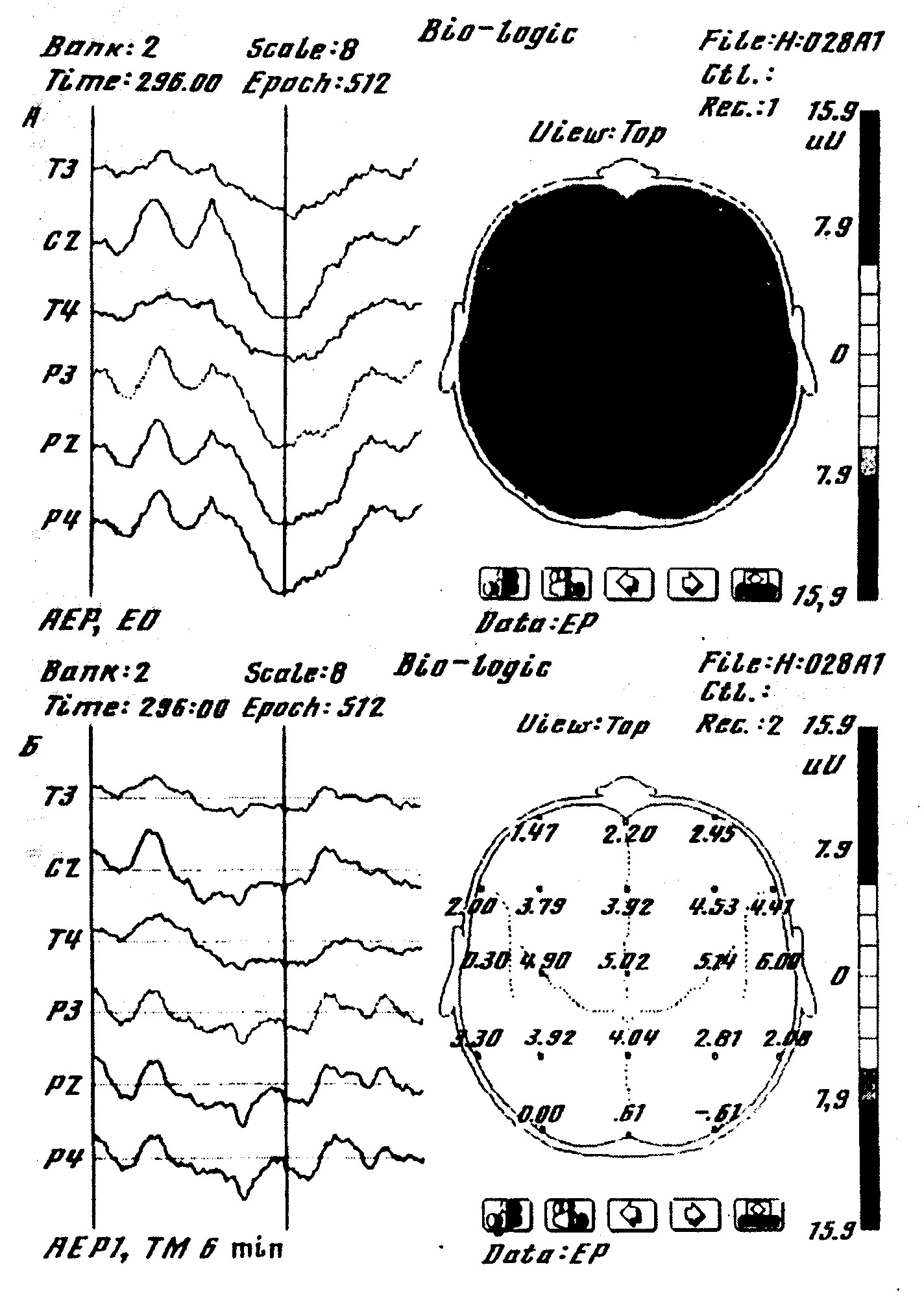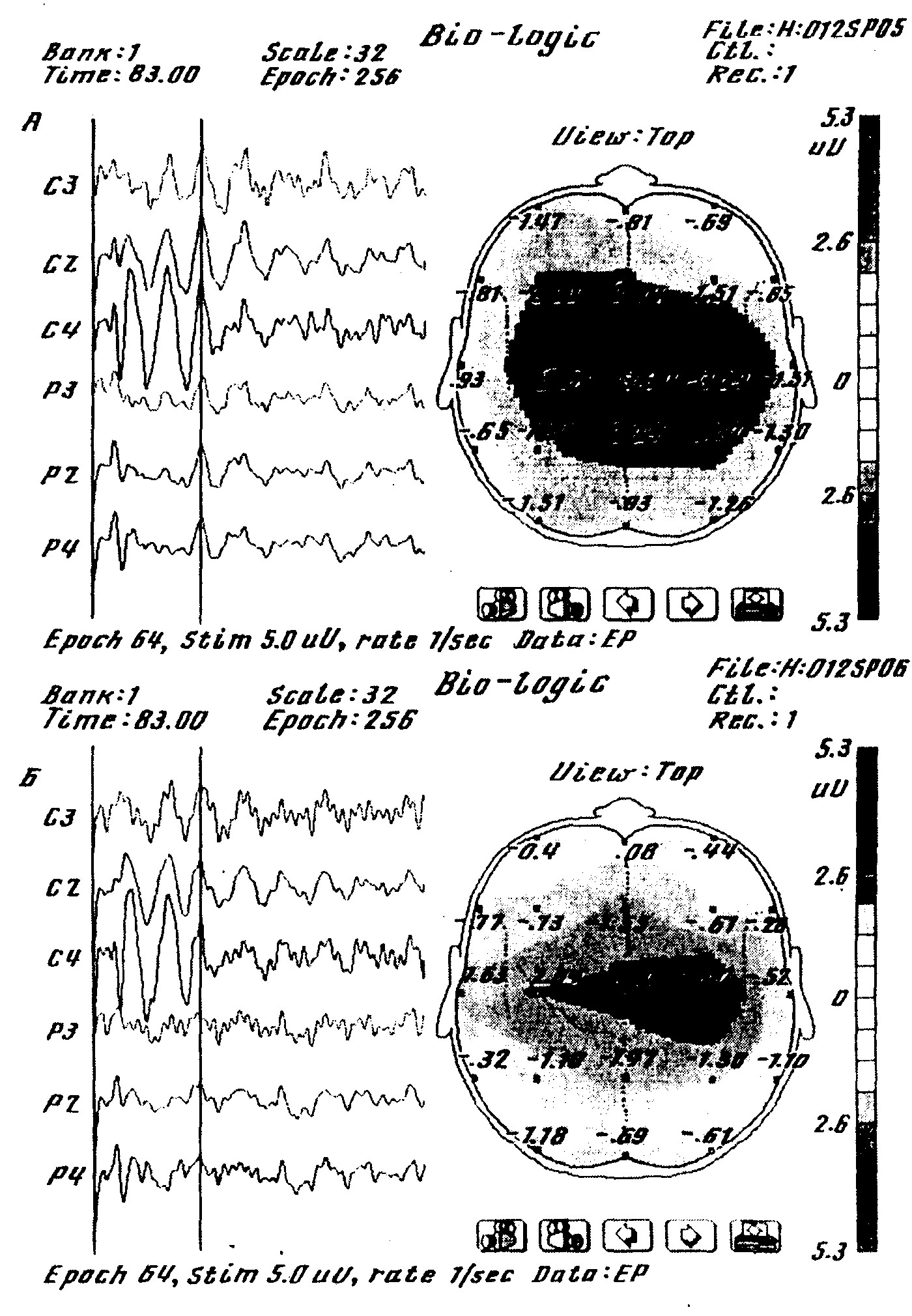 Для регистрации и анализа в реальном масштабе времени ССВП и СВП у испытуемых был использован аппаратурный комплекс вместе со специализированным компьютером “Bio-logic Brain Atlas II” (США). Компьютер этого комплекса имел программы для усреднения ВП, для топологии компонентов ВП в коре обоих полушарий головного мозга, для топологии спектральной мощности для любой частоты ЭЭГ, программы по статистике и т.д. Полоса пропускания каждого из 22 каналов усилителя этого комплекса была от 0 до 10000 Гц.