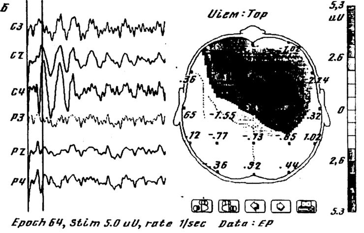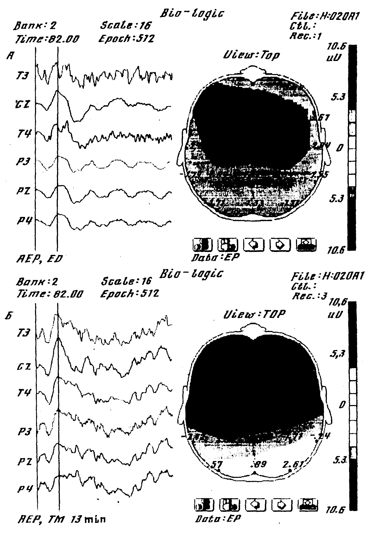 В ходе исследования были показаны специфические изменения топологии распределения ранних (до 80 мс) и поздних комплексов соматосенсорных и слуховых вызванных потенциалов. Отмеченные изменения носили характер расширения и сужения зоны регистрации соответствующих корковых компонентов ССВП и СВП.