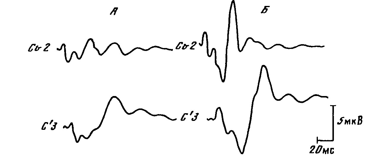 Рис. 6. ССВП в ядрах дорсальных столбов спинного мозга (Сv2) и в соматосенсорной коре левого полушария (СЗ) в ответ на раздражения правого срединного нерва у медитатора N20 до (A) и во время (Б) медитации