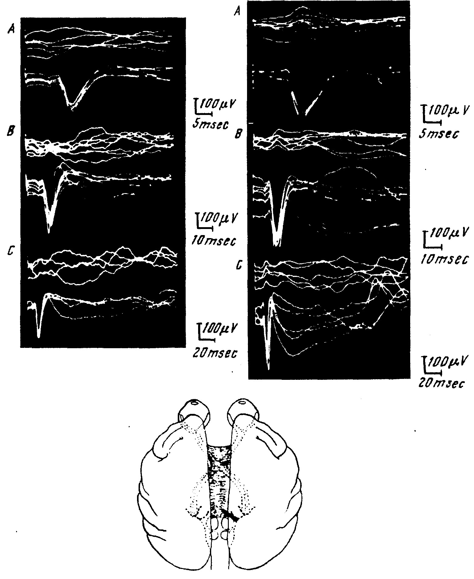 Рис. 8. Суперпозированные ВП в симметричных структурах соматосенсорной коры обоих полушарий головного мозга у обезьян на раздражения правой верхней конечности до (слева) и после (справа) перерезки правой половины покрышки среднего мозга. А, В, С- развертка луча 5, 10 и 20 мс. Острый опыт.