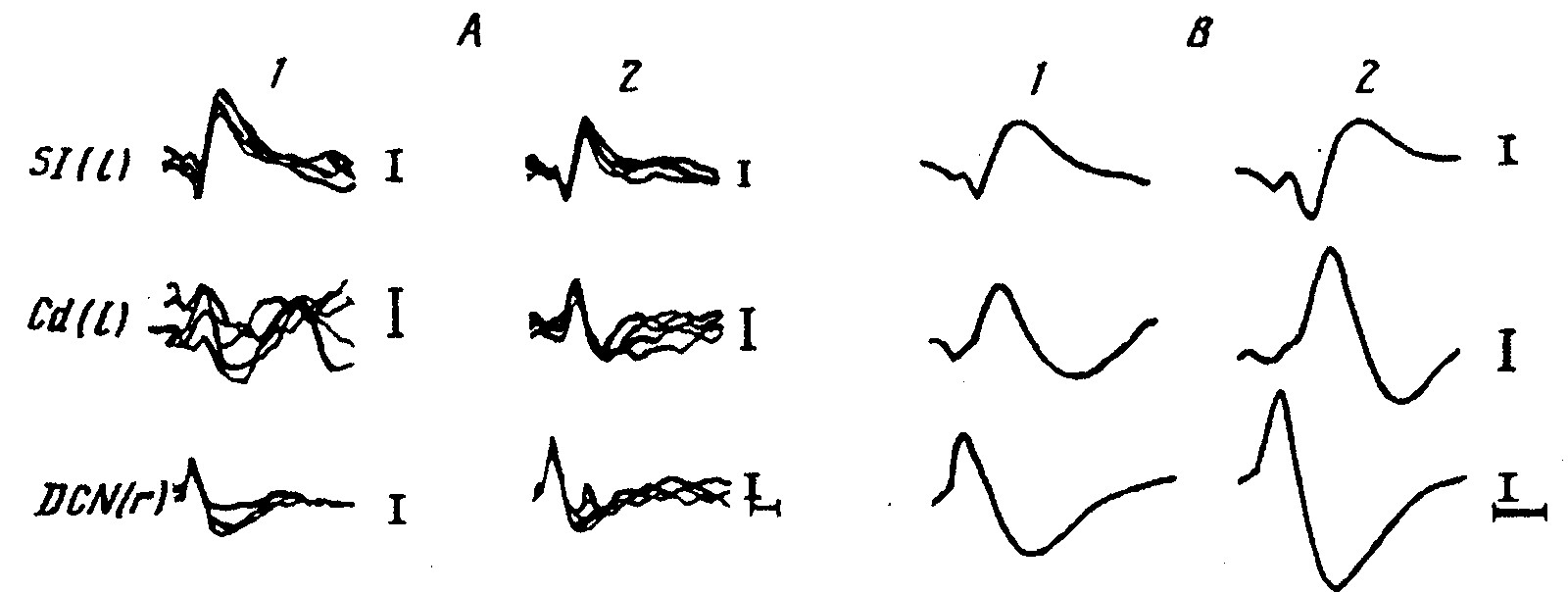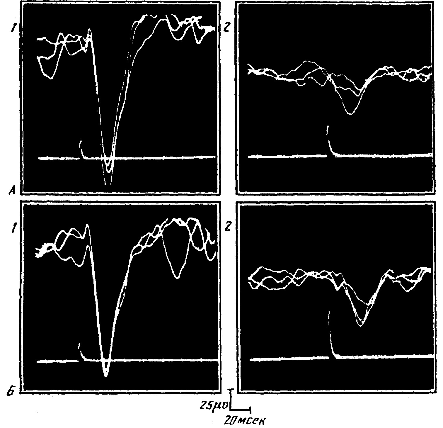 Рис. 9. Суперпозированные ВП в симметричных структурах задних холмов у обезьяны при действии звуковых раздражений (щелчков) после перерезки левой половины покрышки среднего мозга. Острый опыт. Тиопенталовая анестезия. А – действие звуковых раздражений на правое ухо через введенный в правый слуховой проход иерфон, Б – на левое ухо через введенный в левый слуховой проход иерфон. / -СВП в левом заднем холме, 2 – СВП в правом заднем холме. Интенсивность каждого звукового раздражения 60 дб над порогом слышимости человека около уха животного ментальных структурах мозгового ствола. Эти результаты свидетельствуют о постоянном тормозном контроле ядер дорсальных столбов спинного мозга со стороны механизмов центрального торможения, которые регулируют широту соответствующих соматосенсорных афферентных проекций в направлении коры головного мозга.