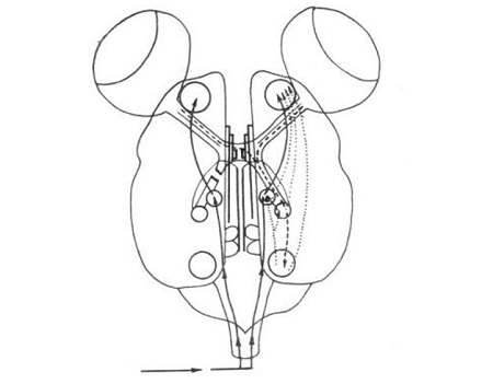Применительно к исследованию мозга животных эти подходы проявились в нейрохирургических перерезках каналов анализаторов (рис. 1 и 2), благодаря которым в лаборатории родился ряд новых научных гипотез и концепций. Среди них – концепция многоканальной структурно-функциональной организации мозга (рис. 3). Было показано, что специфическая сигнализация от рецепторного звена анализатора достигает соответствующей корковой проекционной зоны не только по классическим, но и по дополнительным транскомиссуральным афферентным каналам связи. Была показана роль этих неклассических афферентных каналов для процессов перцепции и межанализаторной интеграции поведенческих актов, а также в компенсаторно-восстановительных процессах. Были исследованы сосуществующие механизмы разного уровня мозга, реорганизация его структурно-функциональных связей в условиях нормы и патологии, скрытые резервы мозга и их функциональная мобилизация.