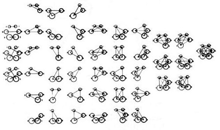 рис. 3: Схема условно рефлекторных взаимодействий каждого афферентного канала зрительного анализатора с каждым из афферентных каналов кожно-двигательного канала (при трехканальном составе анализаторов) в различных комбинациях