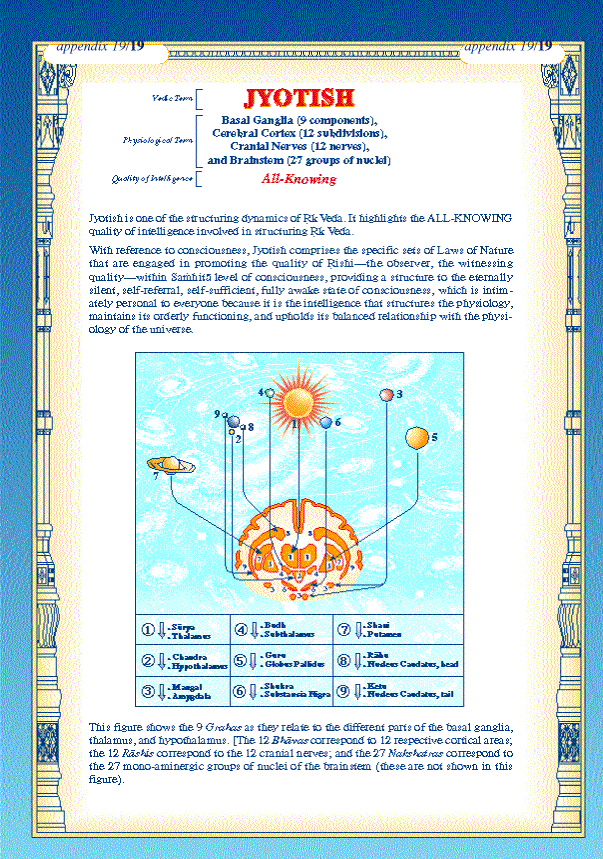 Джйотиш — одна из структурирующих динамик Рикведы. Это подчеркивает качество ВСЕЗНАНИЯ, связанное со структурированием Рикведы. Что касается сознания, Джйотиш включает в себя определенные наборы законов Природы, которые участвуют в продвижении качества Риши — качества наблюдателя, качества свидетеля — на уровне сознания Самхиты, обеспечивая структуру вечно безмолвному, самообращенному, самодостаточное, полностью бодрствующее состояние сознания, интимно личное для каждого.