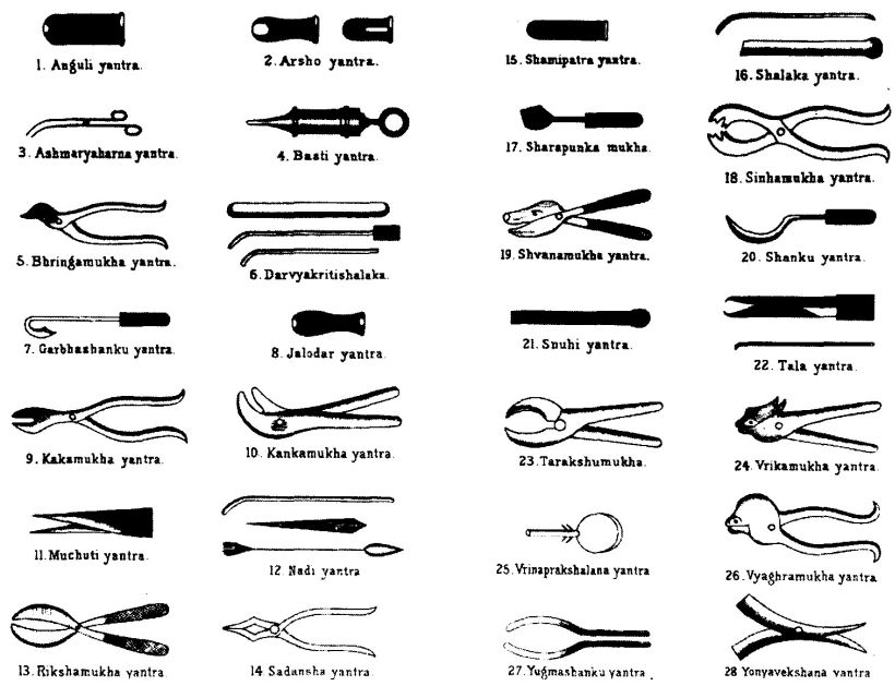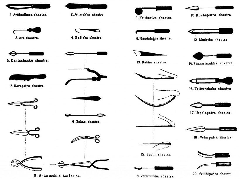 Медицинская практика в древней Индии также намного опережала практику в других странах и во многих отношениях конкурирует с нашими нынешними процедурами. 2600 лет назад в ведических медицинских текстах «записаны сложные операции, такие как кесарево сечение, катаракта, протезы, переломы, грыжа, кишечная хирургия, удаление камней мочевого пузыря, ринопластика или пластическая хирургия носа, а также операции на головном мозге, а также наложение швов, знание необходимых инструментов для определенных операций, типов щипцов, хирургических зондов, игл и режущих инструментов. Было описано и использовано более 125 хирургических инструментов, в том числе ланцеты, щипцы, катетеры и т.д., многие из которых такие же или похожие на те, которые мы имеем сегодня. Глубокое знание анатомии, физиологии, этиологии, эмбриологии, пищеварения, обмена веществ, генетики и иммунитета также найдено в этих текстах». [7]
