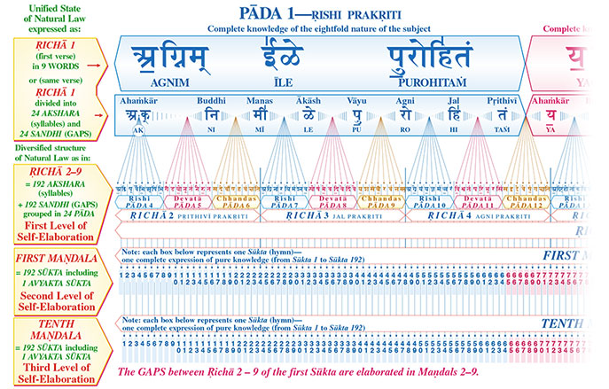 Из оживленного семени тотального знания, выраженного в первом слове Риг-Веды – “АГНИМ” – тотальность Вед и Ведической литературы разворачивается в идеальной последовательности. Каждая разработанная стадия служит комментарием механики трансформации, представленной в промежутке, который предшествует ей. 24 промежутка между слогами первого ричи раскрыты в 24 падах следующих 8 ричи. 192 промежутка между 192 слогами 8 ричи (2-9) первой сукты раскрыты в 192 суктах первой мандалы Риг-Веды — 191 сукта + 1 авьякта (непроявленная) сукта — в то время как 192 слога сами по себе проявляют 192 промежутка между 192 суктами первой мандалы. Эти промежутки, в свою очередь, раскрыты в 192 суктах десятой мандалы. Дополнительно, каждая из 8 ричи (2-9) в первой сукте порождает последовательно одну из последующих 8 мандал Риг-Веды (мандалы 2-9).