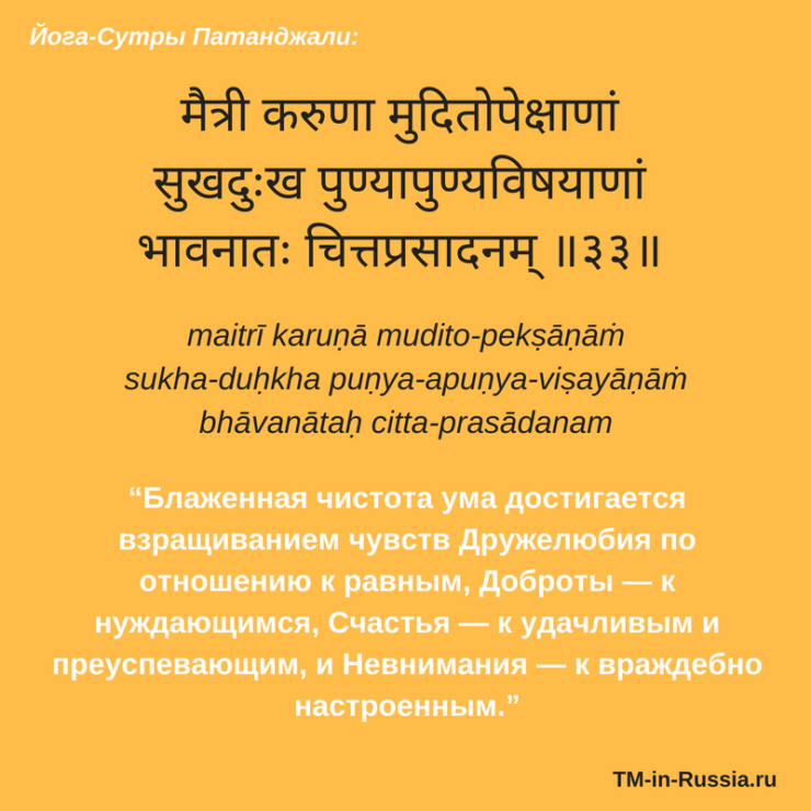 Сегодня разбираем йога-сутру Махариши Патанджали 1.33. Культивируя четыре чувства – Дружелюбие, Доброту, Счастье и Невнимание – йог: