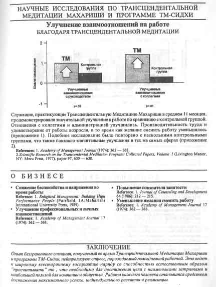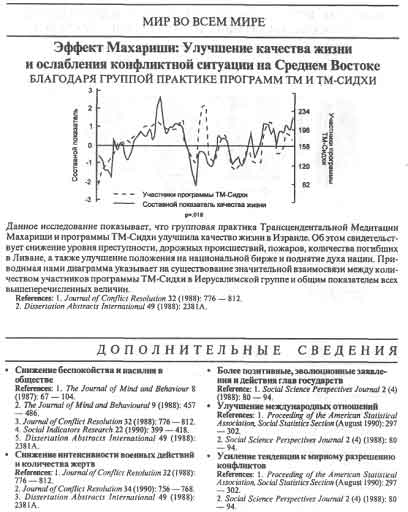 Кажется, что утверждение Махариши, согласно которому открытие Единого Поля предлагает разрешение всех проблем, начинает подтверждаться систематически и объективно. На теоретическом уровне мы видим, что Ведическая и современная науки описывают одну и ту же реальность. На уровне практическом результаты научных исследований обозначили контакт с этой главной реальностью, открывающей путь к глобальному улучшению качества жизни и освобождению от любых проблем.