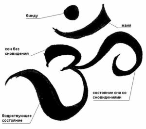 Четвертое состояние сознания. Точка, в которой сходятся три кривые, показывает четвертое состояние сознания, известного на санскрите как “турия”: “не имеющее частей, неизречённое, растворение проявленного мира, приносящее счастье, недвойственное” (Мандукья Упанишад, 7). В таком состоянии сознание не направлено ни за пределы тела, ни внутрь себя, ни в обоих этих направлениях вместе. Достигшее этой точки сознание находится в состоянии отдохновения от всего раздробленного, относительного существования. Это совершенно тихое, мирное и блаженное состояние является окончательной целью всей духовной деятельности. Такое абсолютное состояние как бы освещает все три остальные.