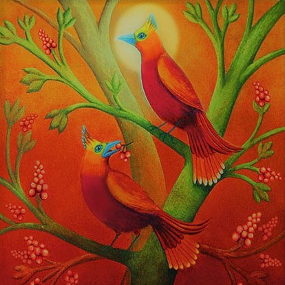 На одном дереве жили две птицы. Первая птица хотела питаться только сладкими плодами, но дерево иногда давало и горькие плоды. Однажды все плоды на дереве родились горькими, первая птица закричала от горя. В страдании, она посмотрела наверх и впервые в жизни заметила вторую птицу. Вторая птица всегда была спокойна и довольна, какие бы плоды ни рождало дерево, она оставалась невозмутимой. Заинтересованно, первая птица стала перепрыгивать с ветки на ветку. Когда она достигла верхней ветки, то обнаружила, что никакой второй птицы нет, второй птицей всегда была она сама.