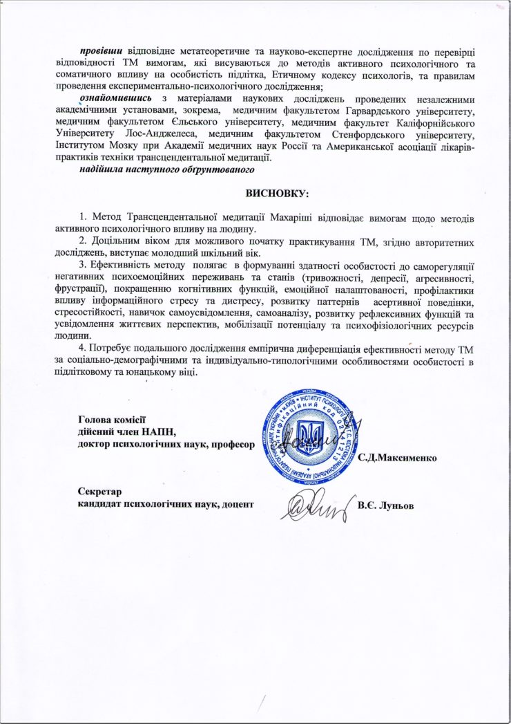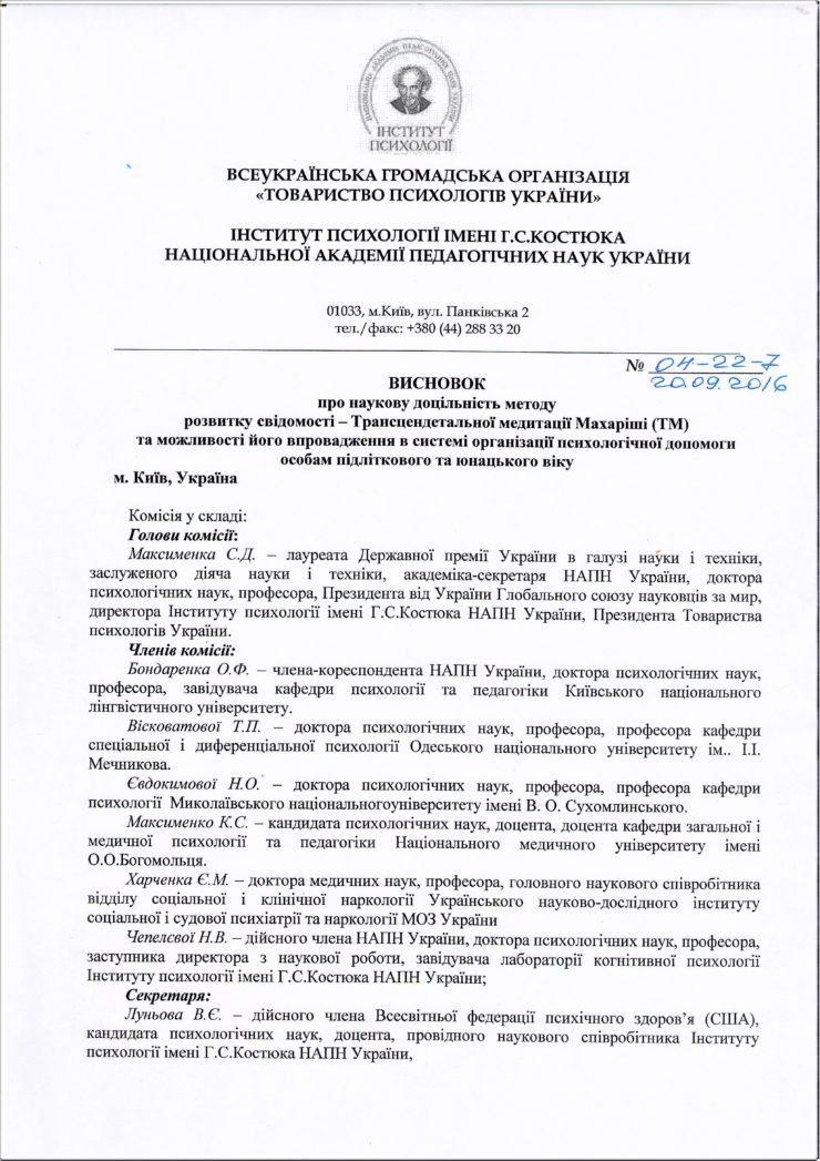 ознакомившись с материалами научных исследований, проведенных независимыми академическими учреждениями, в частности, медицинским факультетом Гарвардского университета, медицинским факультетом Йельского университета, медицинским факультет Калифорнийского Университета Лос-Анджелеса, медицинским факультетом Стэнфордского университета, Институтом Мозга при Академии медицинских наук России и Американской ассоциации врачей-практиков техники трансцендентальной медитации;